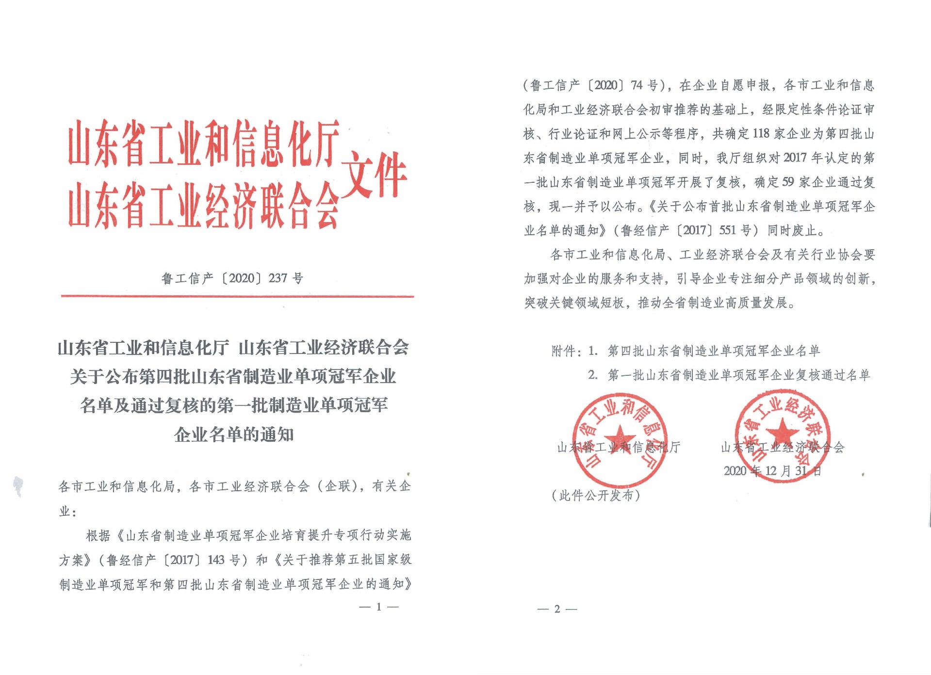 制造業(yè)單項(xiàng)冠軍企業(yè)是指長(zhǎng)期專注于制造業(yè)某些特定細(xì)分產(chǎn)品市場(chǎng),生產(chǎn)技術(shù)或工藝國(guó)際領(lǐng)先,單項(xiàng)產(chǎn)品市場(chǎng)占有率位居全球前列的企業(yè)。此項(xiàng)榮譽(yù)是山東省對(duì)我司產(chǎn)品研發(fā)實(shí)力和對(duì)核心產(chǎn)品技術(shù)開拓進(jìn)取、攻堅(jiān)克難的實(shí)力認(rèn)可,同時(shí)也是對(duì)我司上下一致、刻苦鉆研、積極創(chuàng)新精神的肯定。