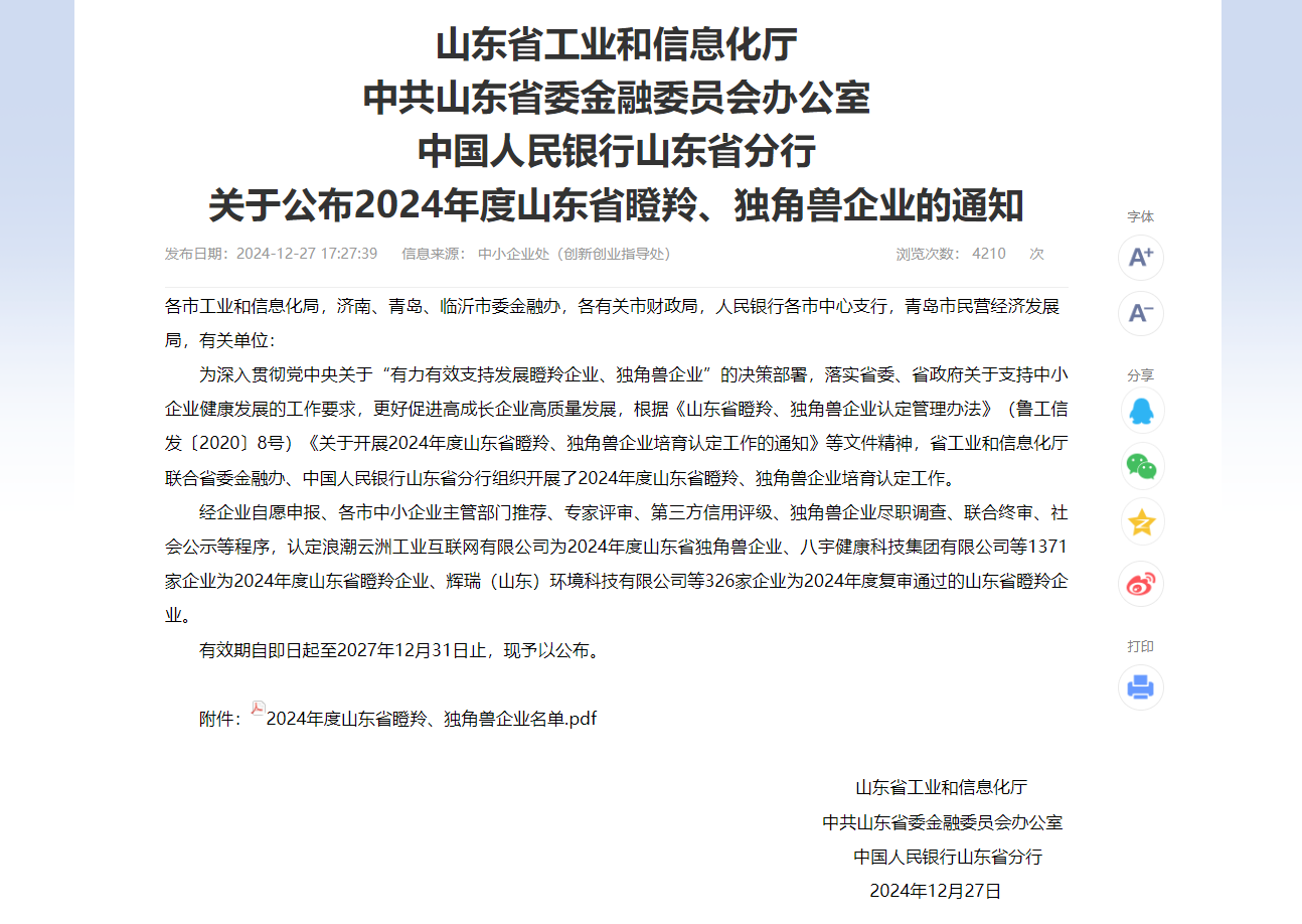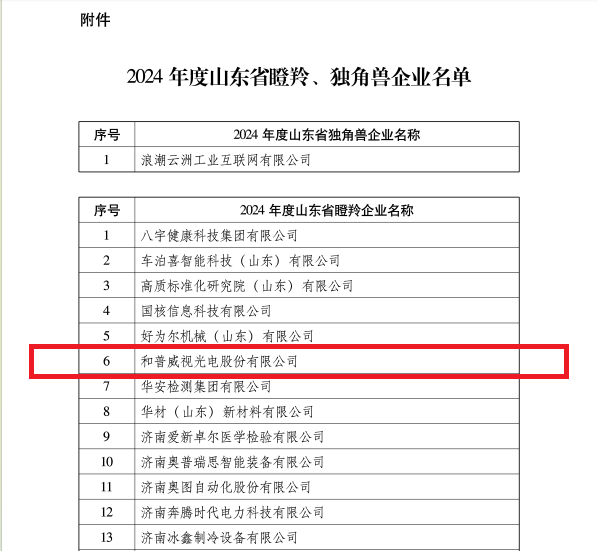 近日,山東省工業(yè)和信息化廳、中共山東省委金融委員會(huì)辦公室、中國人民銀行山東省分行公布2024年度山東省瞪羚、獨(dú)角獸企業(yè)名單。和普威視成功入選。